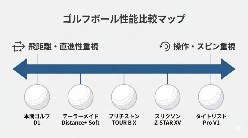 まずは「本間ゴルフ D1」または「ブリヂストン TOUR B X」から始めてください。ボールは、最も安く試せるドライバーのチューニングです。ティーショットの安定感を武器に、まずはスコアメイクの土台を固めましょう。