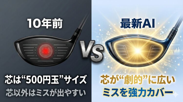 「左:10年前の標準モデル(芯が狭い) / 右:最新10Kモデル(ミスヒットに強い)」