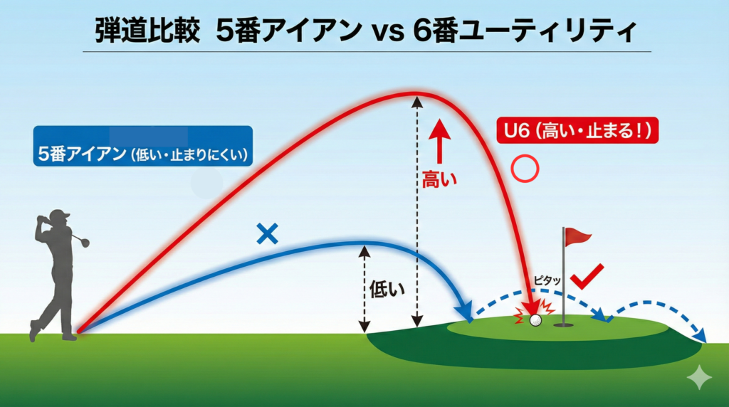 [5番アイアンの低い暴走弾道 vs UT6の高い落下弾道イメージ]