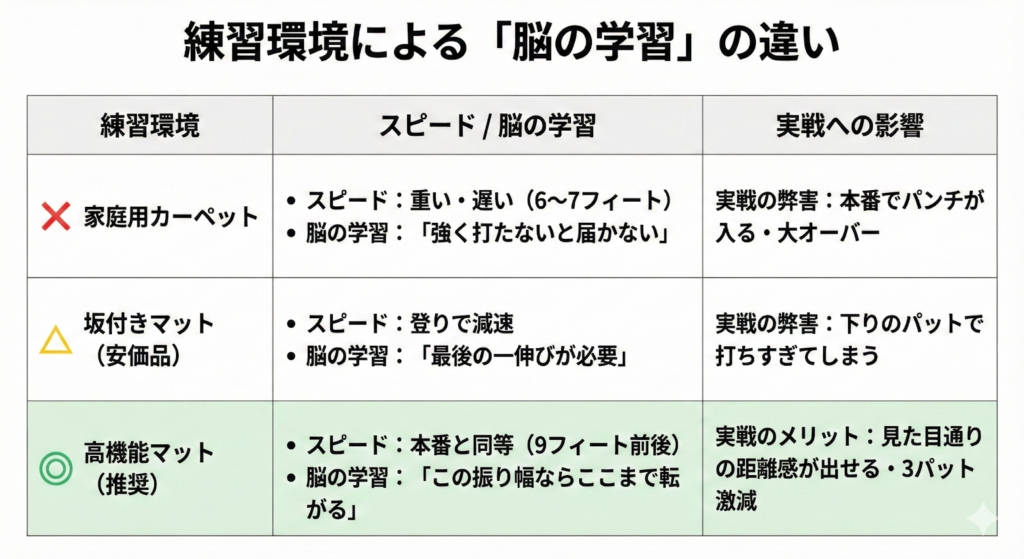 結論から言うと、家のカーペット練習こそが「3パットの癖」を自ら作り出している最大の原因かもしれません。